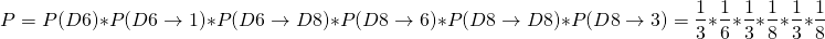 同上,我们可以计算第三个骰子是D6或D8时的最大概率。我们发现,第三个骰子取到D4的概率最大。而使这个概率最大时,第二个骰子为D6,第一个骰子为D4。所以最大概率骰子序列就是D4 D6 D4。